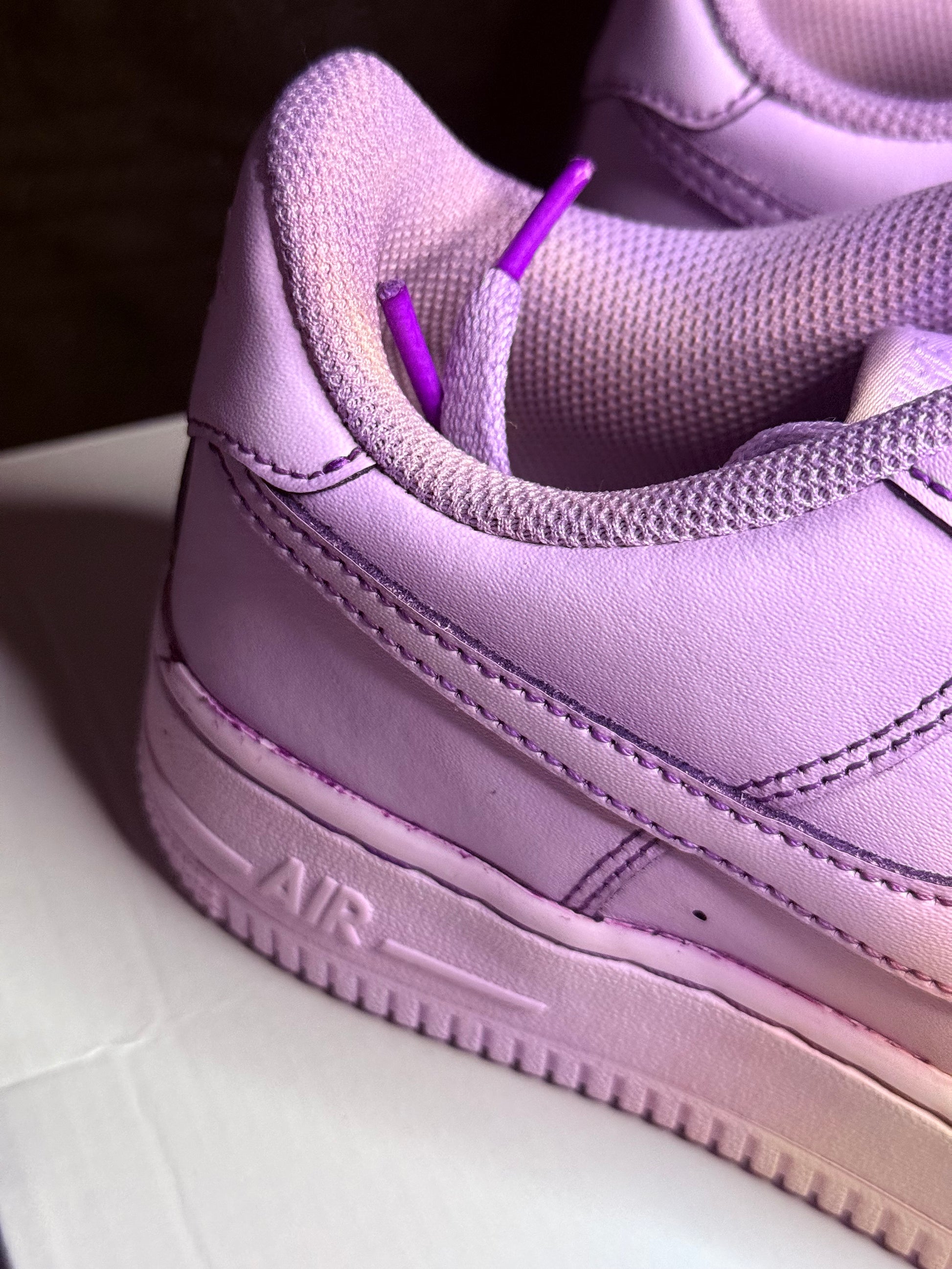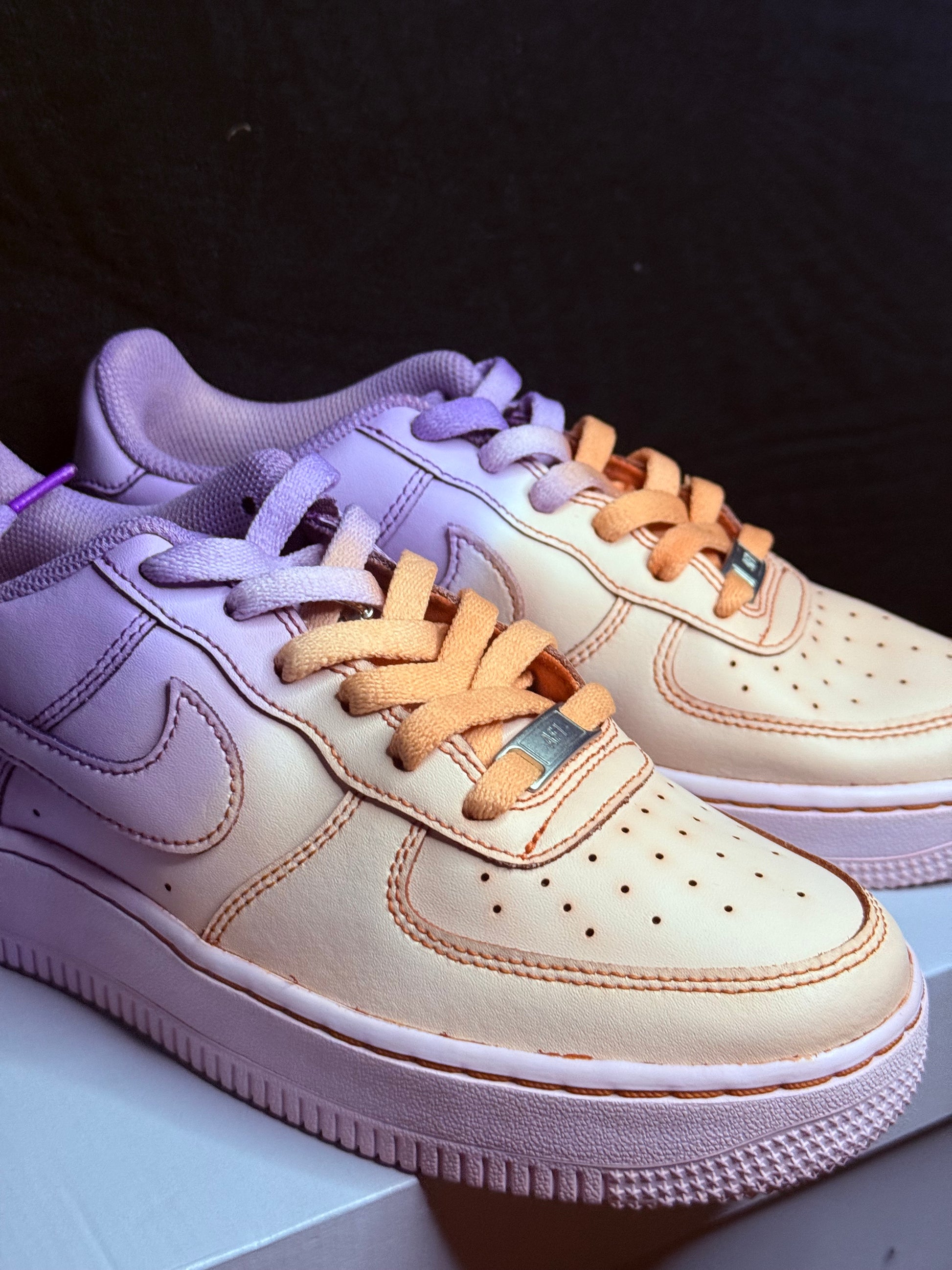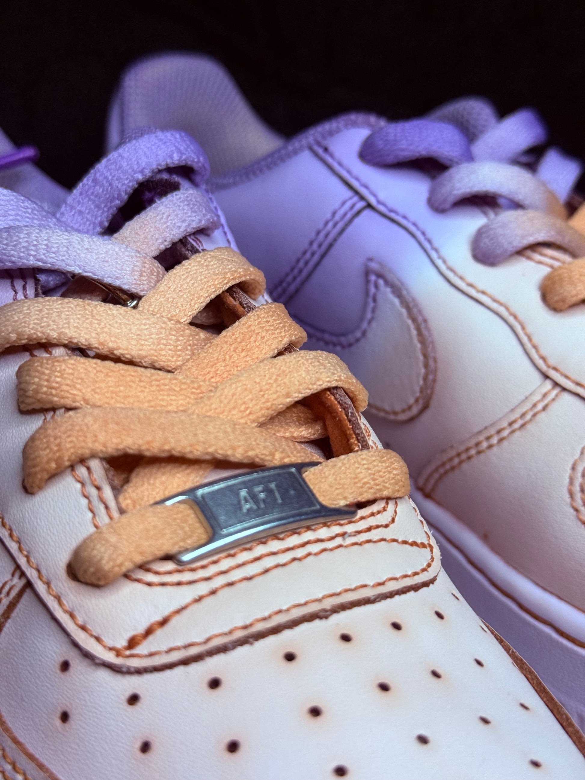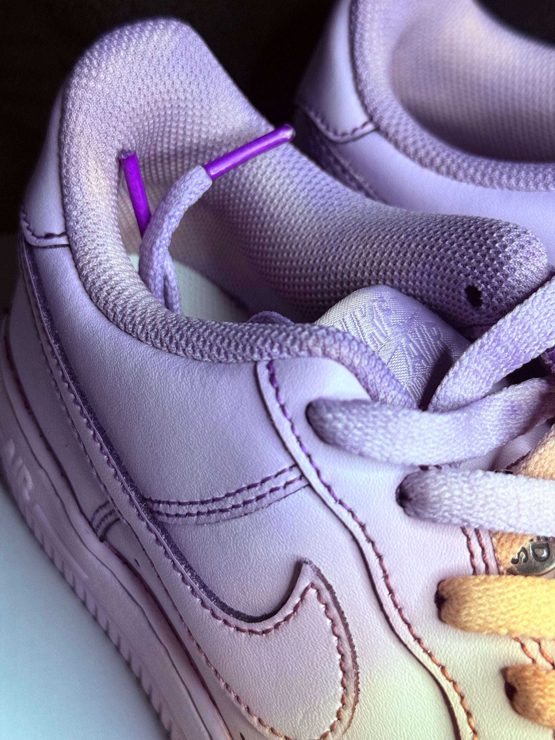 AF1 je klasika, ktorá nikdy nevyjde z módy, rovnako ako prispôsobenie s fialovým/oranžovým odtieňom, ktorý pripomína tóny západu slnka; ladiaca čipka s rovnakým dvojfarebným farbivom.